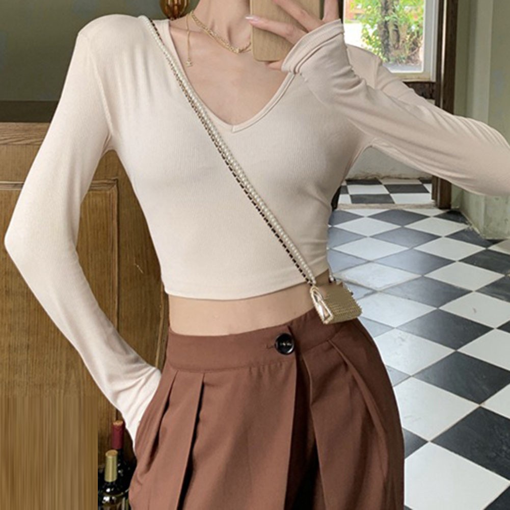 T-shirt femme col V manches longues pour ��t�� tenue d��contract��e et mode