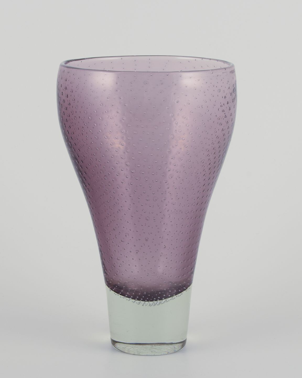 Gunnel Nyman (1909-1948) pour Nuutajärvi Notsjö. Vase en verre d'art moderniste finlandais. Large rare model. Verre d'art soufflé à la bouche avec bulles d'air incrustées. Verre transparent et violet.