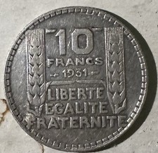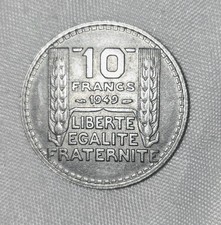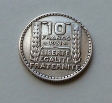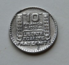 Pièce de 10 Francs Argent Turin 1930. Graveur : Pierre Turin. CompositionArgent 680‰. Profil droit de la Marianne coiffée du bonnet phrygien et d'une couronne végétale. Deux épis de blé entourant la valeur faciale et la devise française.