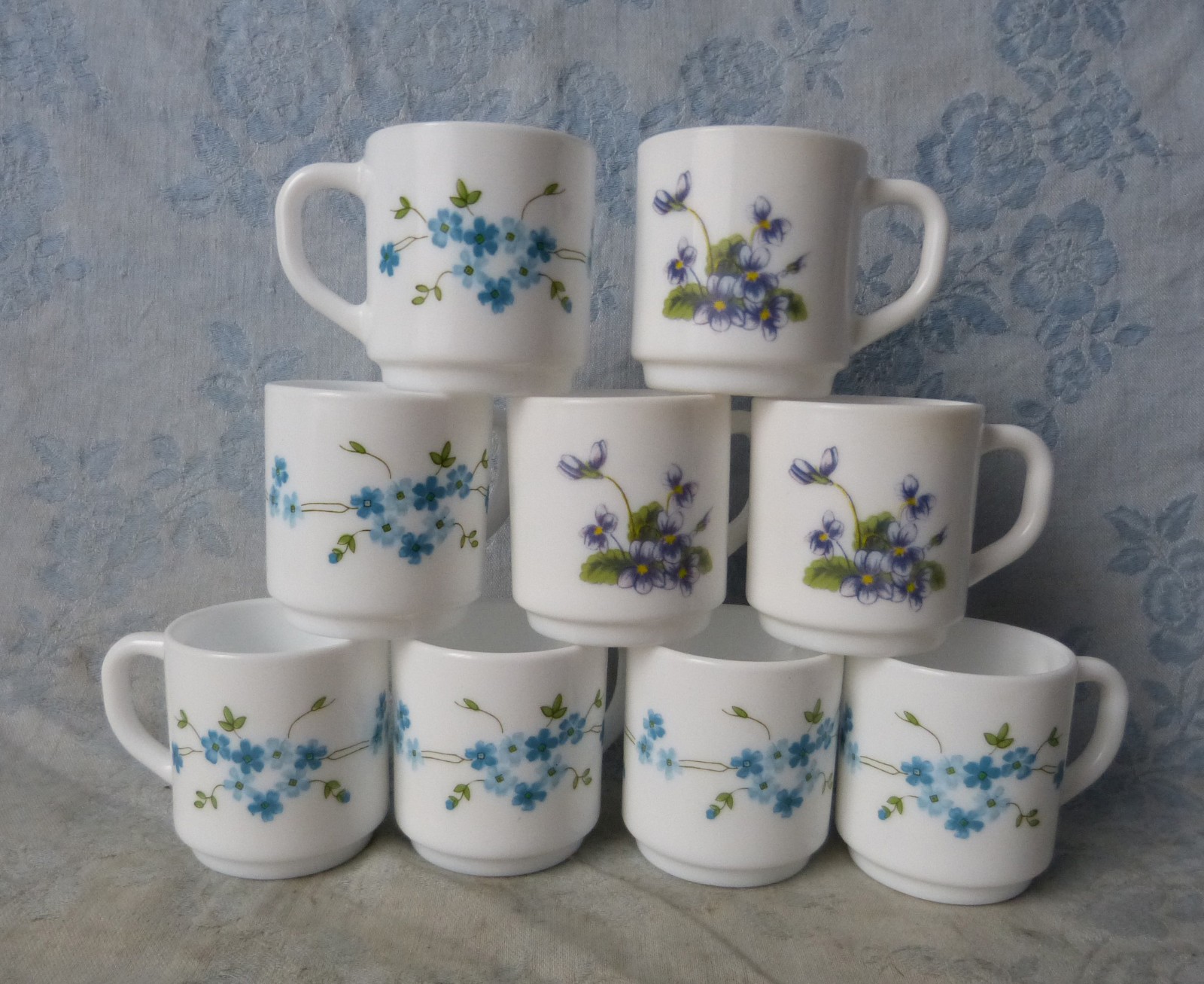 #Art de la table# Arcopal - Vintage / 9 tasses à café (violettes, myosotis)