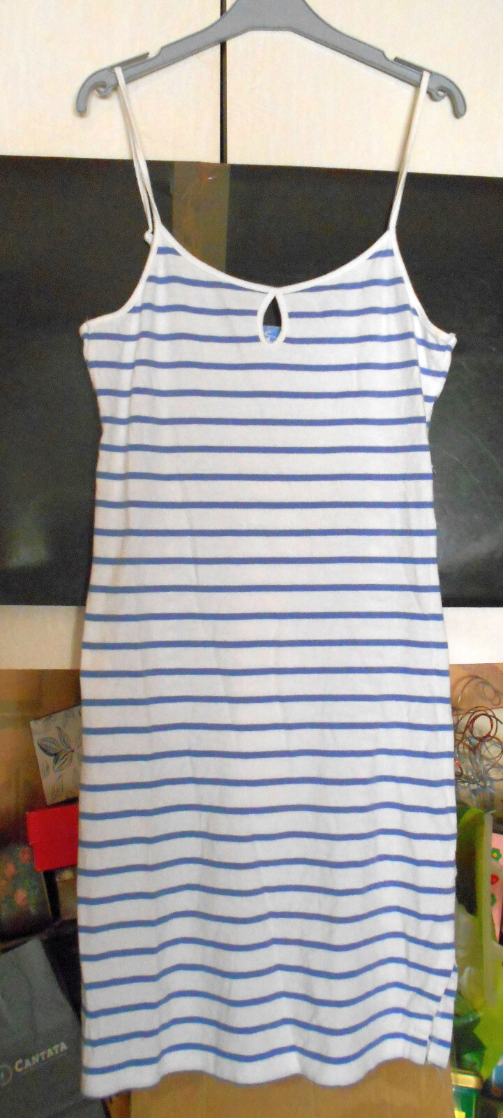 Couleurs blanc rayé bleu horizontale. Taille 36. 100 % coton. fente en bas de chaque côté de 11 cm.
