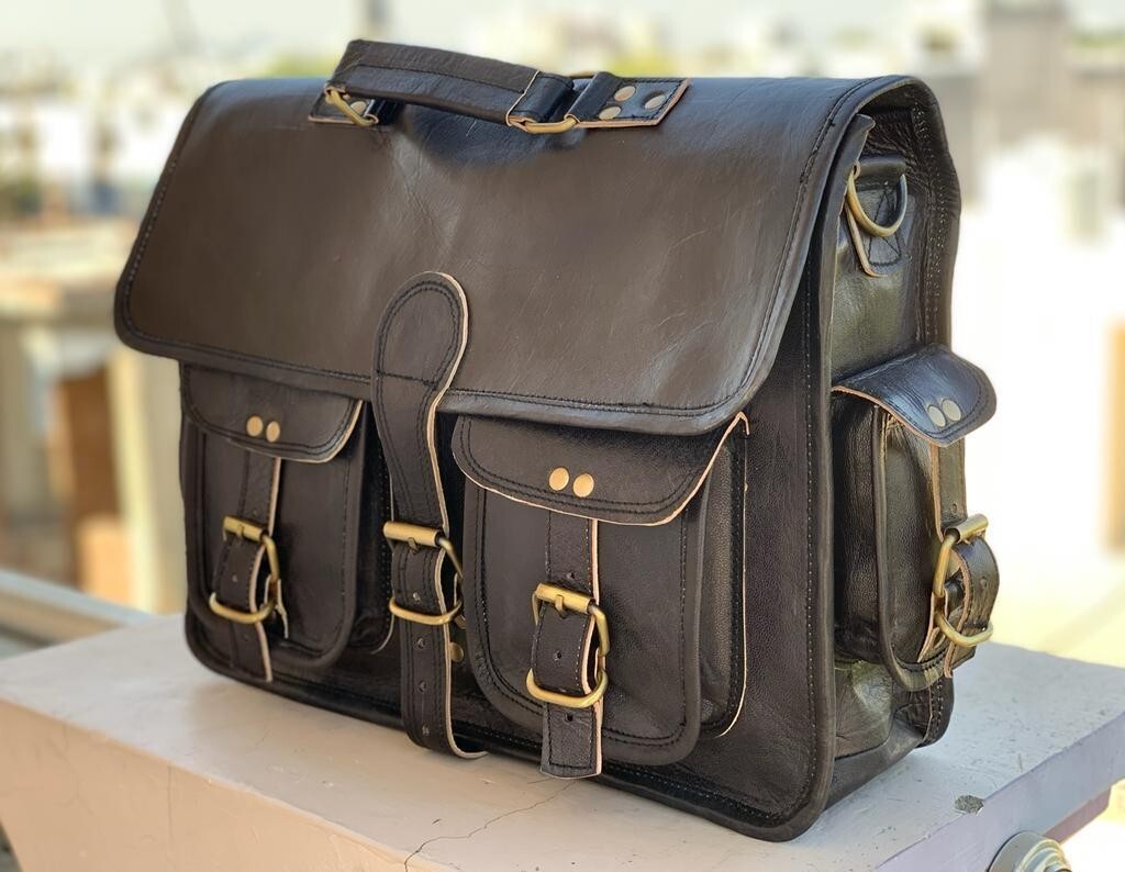 Sacoche pour ordinateur portable en cuir noir véritable. Le cuir s'adoucit et s'assombrit avec l'utilisation. Accessoires en métal en laiton véritable utilisés dans ce sac. Nous offrirons le numéro de suivi.