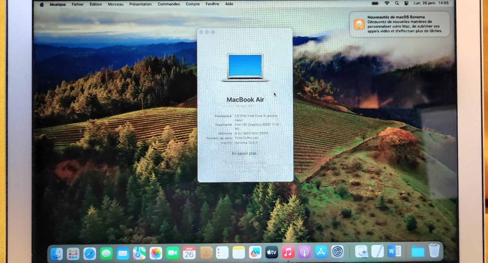 Apple MacBook Air 13,3” (128Go SSD, Intel Core i5 5ème Génération, 1,8 GHz, 8Go). Tourne très bien sur Sonoma 14.8.3 pour de la bureautique La batterie n'est pas neuve mais tient la charge Chargeur inclus