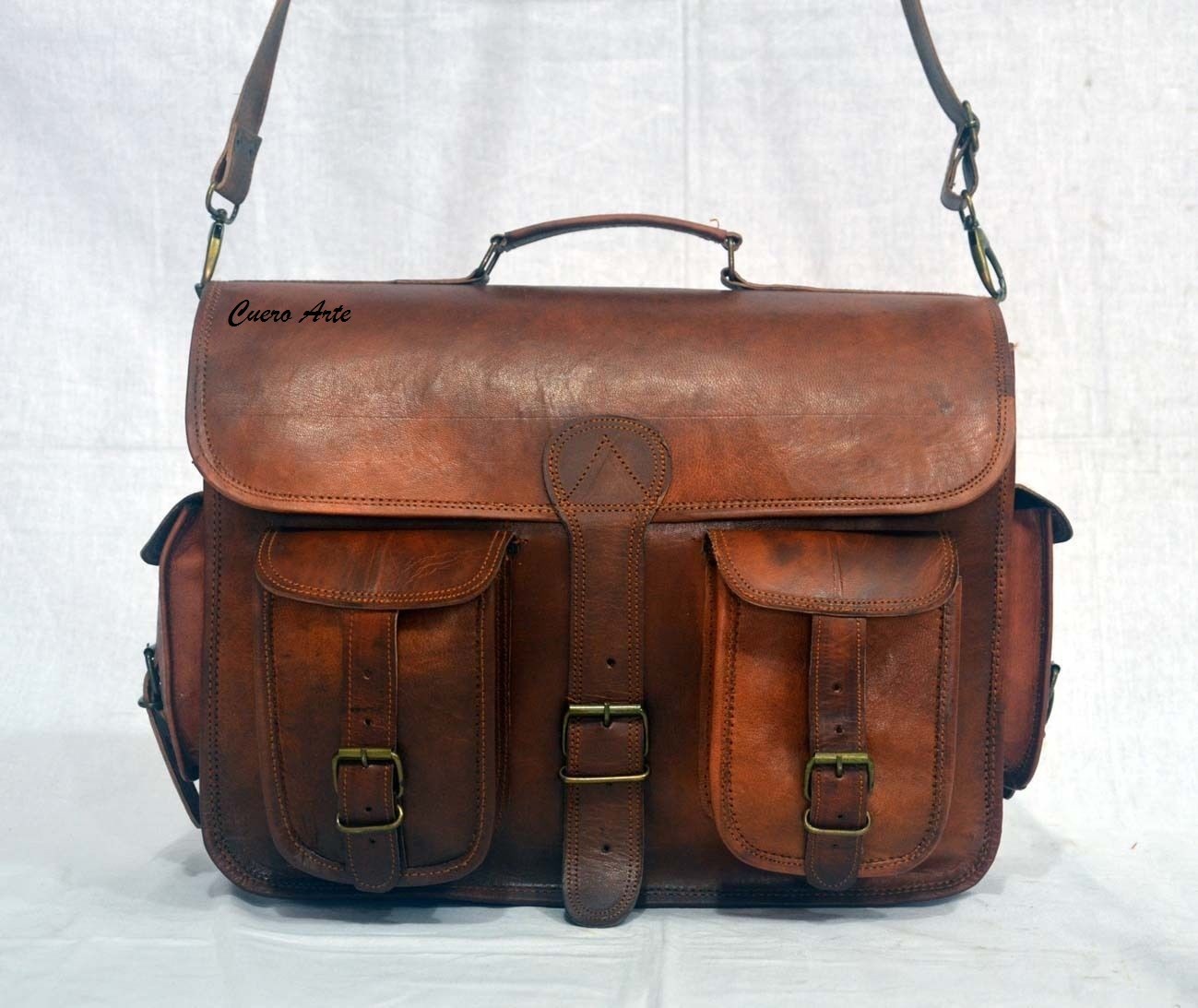 HANDMADE BRIEFCASE SATCHEL BAG. Parts from several hides may be used to make a single leather bag. There may also be visible creases in the leather. 2 small pockets on both side of bag. Green canvas fabric.