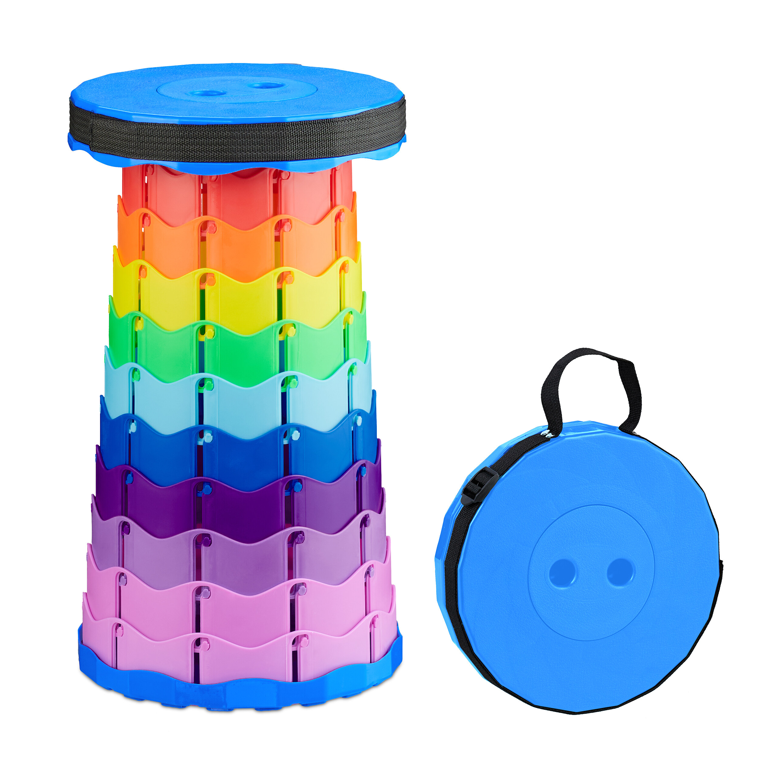Ce tabouret télescopique est idéal en vadrouille. 6,5 x 25 cm. - 1x tabouret pliant. Camping : tabouret télescopique pour les activités en plein air - Déplié H x D : env. 44,5 x 25 cm. Tabouret télescopique en détail.