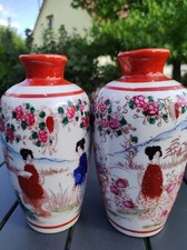 Paire de Vases Asiatiques/Japonais en Céramique émaillée à relief - Scène Geisha