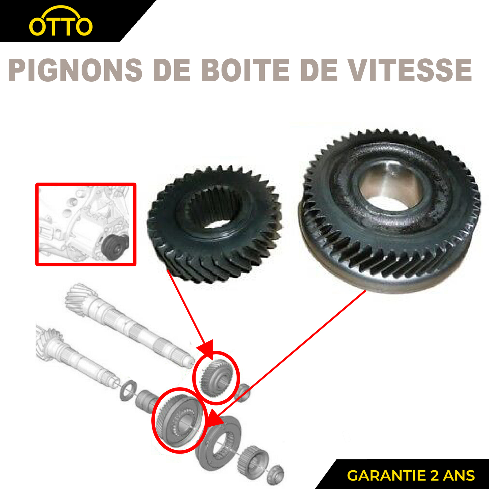 1 x Pignon d'arbre d'entrée - 50 dents (2344F5). 1 x Pignon d'arbre de sortie - 33 dents (2344F5). CITROËN : 2344 F5, 2344. F5, 2344F5. PEUGEOT : 2344 F5, 2344. PIGNONS LEVIER BOITE DE VITESSES - PIGNONS DE DESCENTE - CITROEN ET PEUGEOT BE4.
