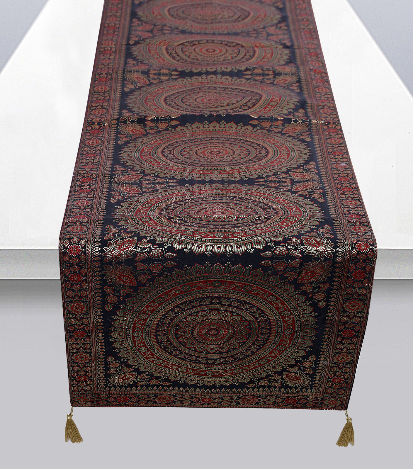 Ce beau chemin de table rendra votre table plus belle lorsque vous vous allongerez sur cette table. Ce chemin de table unique est fabriqué à partir de pure soie Banarasi indienne. Et il est fait à la main.