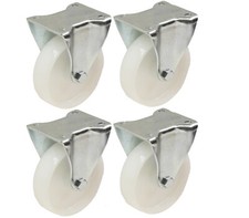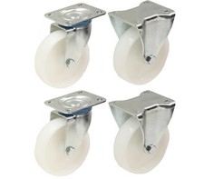 Jeu de 4 roulettes en nylon de 100 mm.La taille de la plaque est de : 100 mm x 80 mm, les centres de trous sont : 80 mm x 60 mm, la hauteur totale : 128 mm, la capacité de poids : 150 kg par roulette (600 kg par jeu).