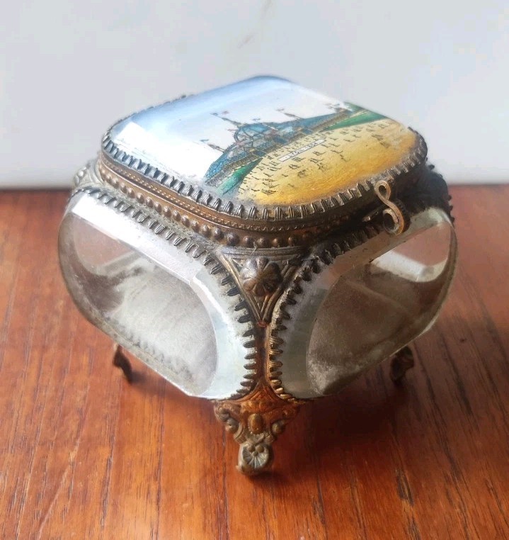 Ancienne petite boite quadripode en verre, Napoléon III. Cerclée de laiton. Un coussin à l’intérieur. Image lyon 1894. 7.5 x 7.5 cm env.