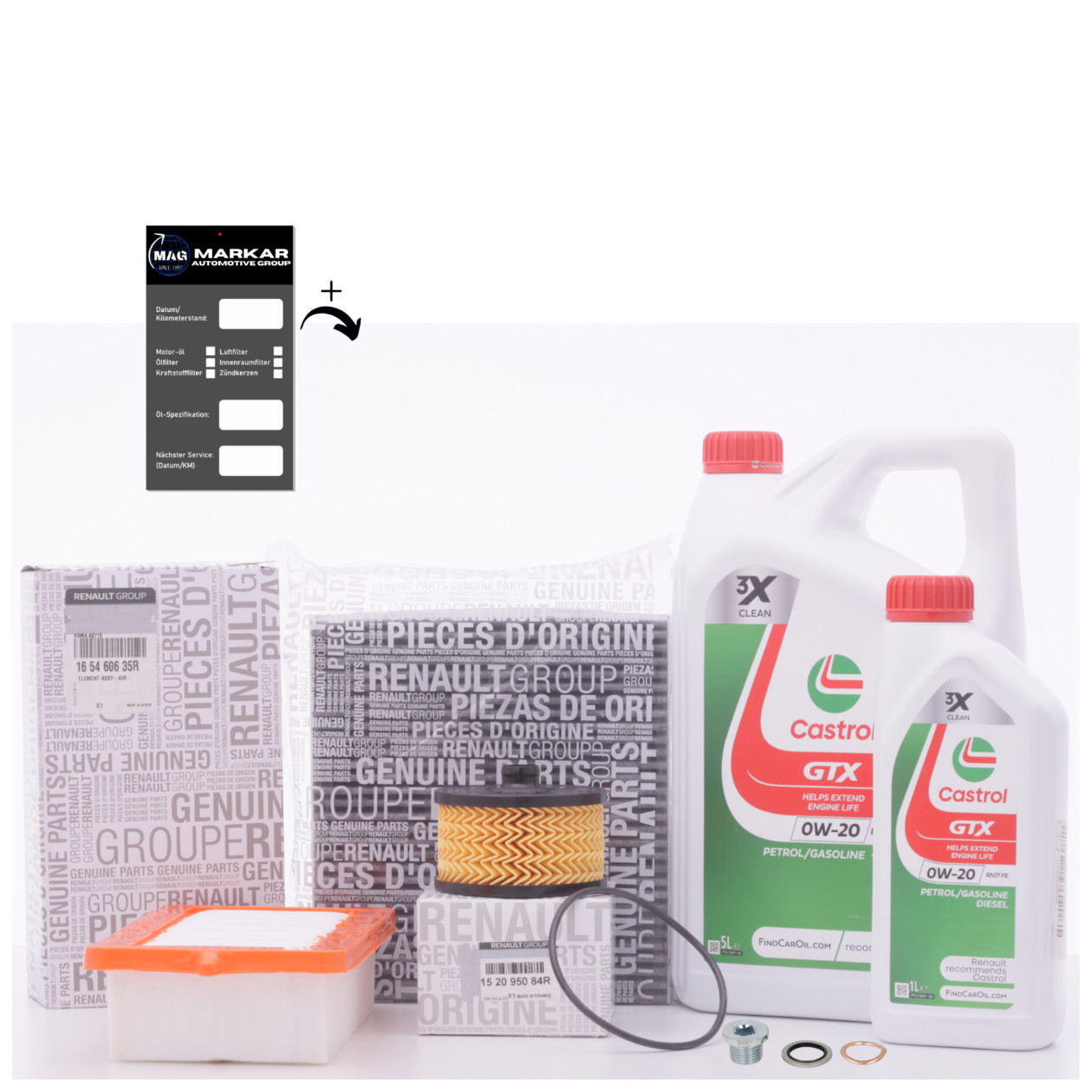 1x HUILE MOTEUR - CASTROL 5L OEM RN17FE 0W20. 1x HUILE MOTEUR - CASTROL 1L OEM RN17FE 0W20. 1x FILTRE À HUILE - OE RENAULT. 1x FILTRE À AIR DE CABINE - OE RENAULT. 1x FILTRE À AIR - OE RENAULT. 1x JOINT DE BONDE DE VIDANGE -.