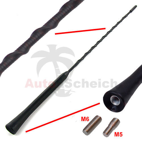 Antenne tige de voiture 40 cm incl. Adaptateur de filetage M5 et M6 Structure enroulée pour une réception optimale des signaux FM/AM, GPS et GSM Filetage interne : M6 avec adaptateurs de filetage externe fournis pour M5 et M6 Longueur d'antenne : 40 cm Finition de haute qualité Couleur : noir Contenu de la livraison : 1 pièce Compatible avec les marques/modèles de voitures : Alfa Romeo, Audi, BMW, Citroën, Chevrolet , Daewoo, Dacia, Daihatsu, FordJeep , Kia, Lancia, Land Rover, Mazda, Mercedes, Mitsubishi, Nissan, Opel, Peugeot, Renault, Rover, Saab, Seat, Skoda, Subaru, Suzuki, Toyota, Volkswagen (VW), Volvo Beaucoup d'autres véhicules avec vis M5 ou M6 fil de discussion.