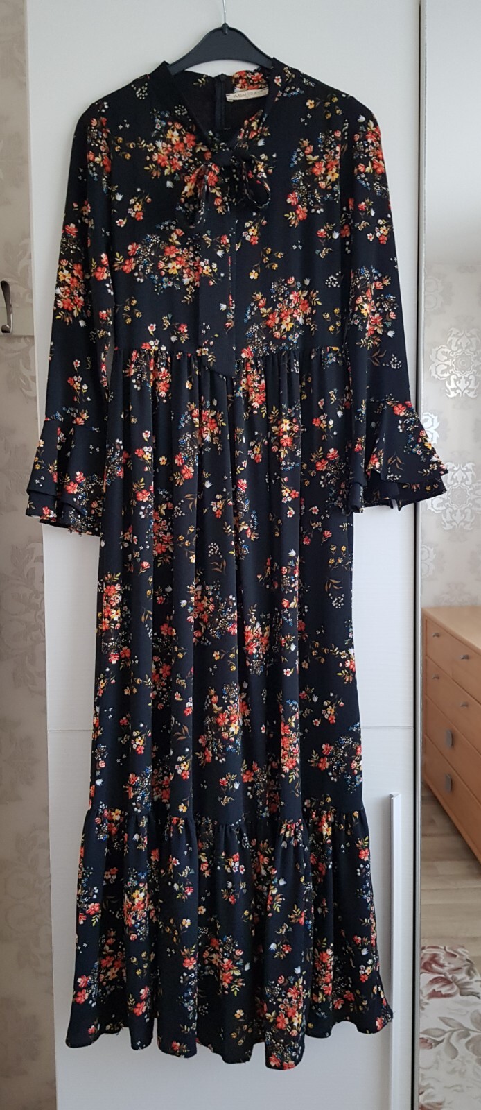 Robe longue noire à fleurs rouge orange jaune. Manches et bas à volant. Taille 36. 70% coton, 30% polyester.
