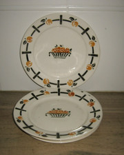 Lot de 6 anciennes assiettes à dessert, fromage. en faïence Badonviller, modèle DOC à décor panier et abricots, art déco. Diamètre 21 cm.