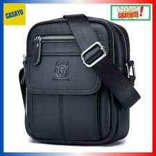 Sacoche en Cuir Véritable Homme Sac Grande capacité bandoulière réglable Noir