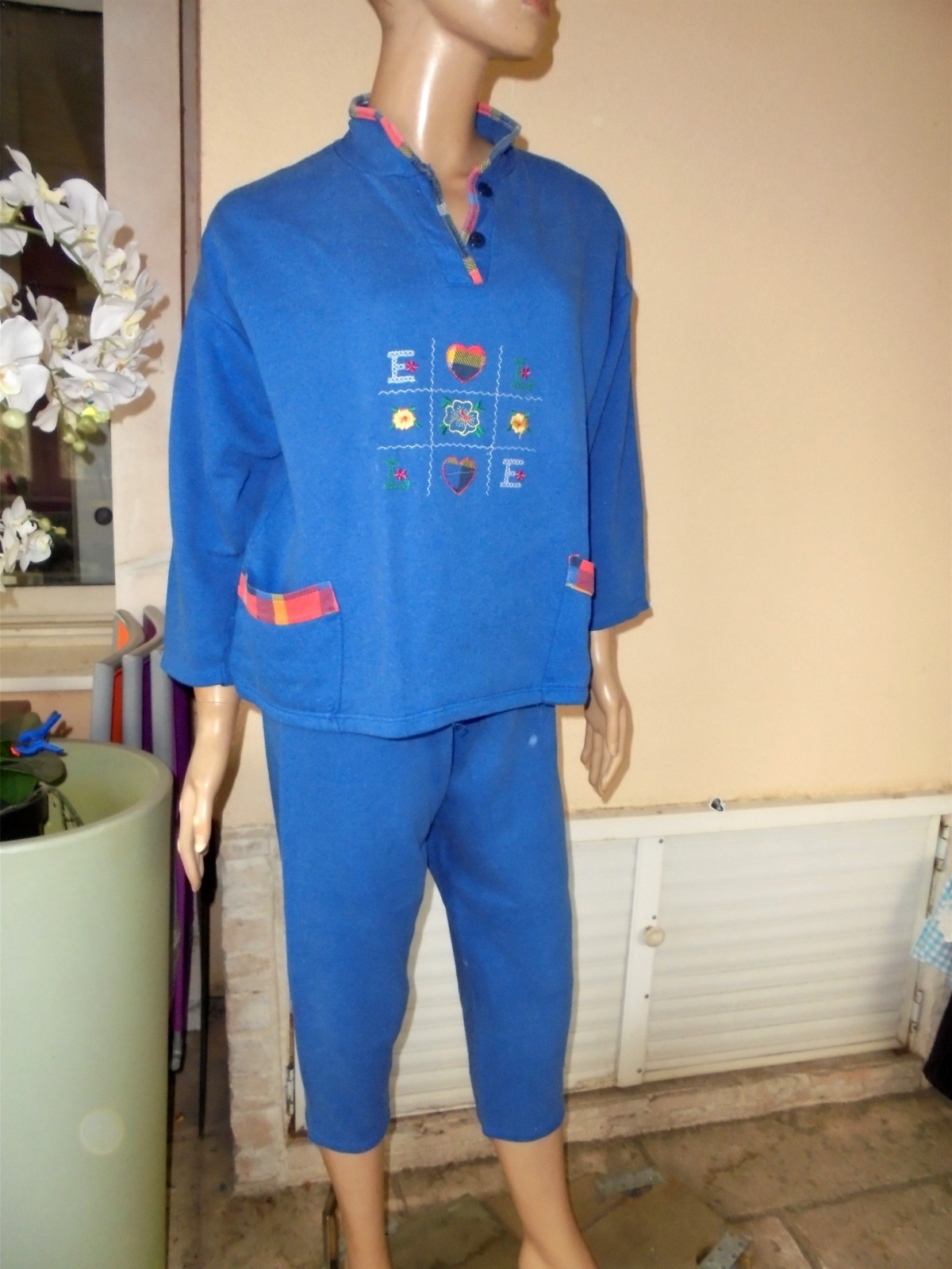 MATIERE COTTON MOLLETONNE. MATIERE 100 % COTTON MOLLETONNE. ENSEMBLE PYJAMA SWEAT + PANTALON ELASTIQUE T 38/40. PYJAMA ROBE DE CHAMBRE NUISETTE ECT. HAUT SWEAT. PANTALON LONG ASSORTI T 38/40. FOND BLEU IMPRESSION DEVANT BRODEE, 2 POCHES AVEC BORDURES ECOSSAISE & DOS UNI BLEU.