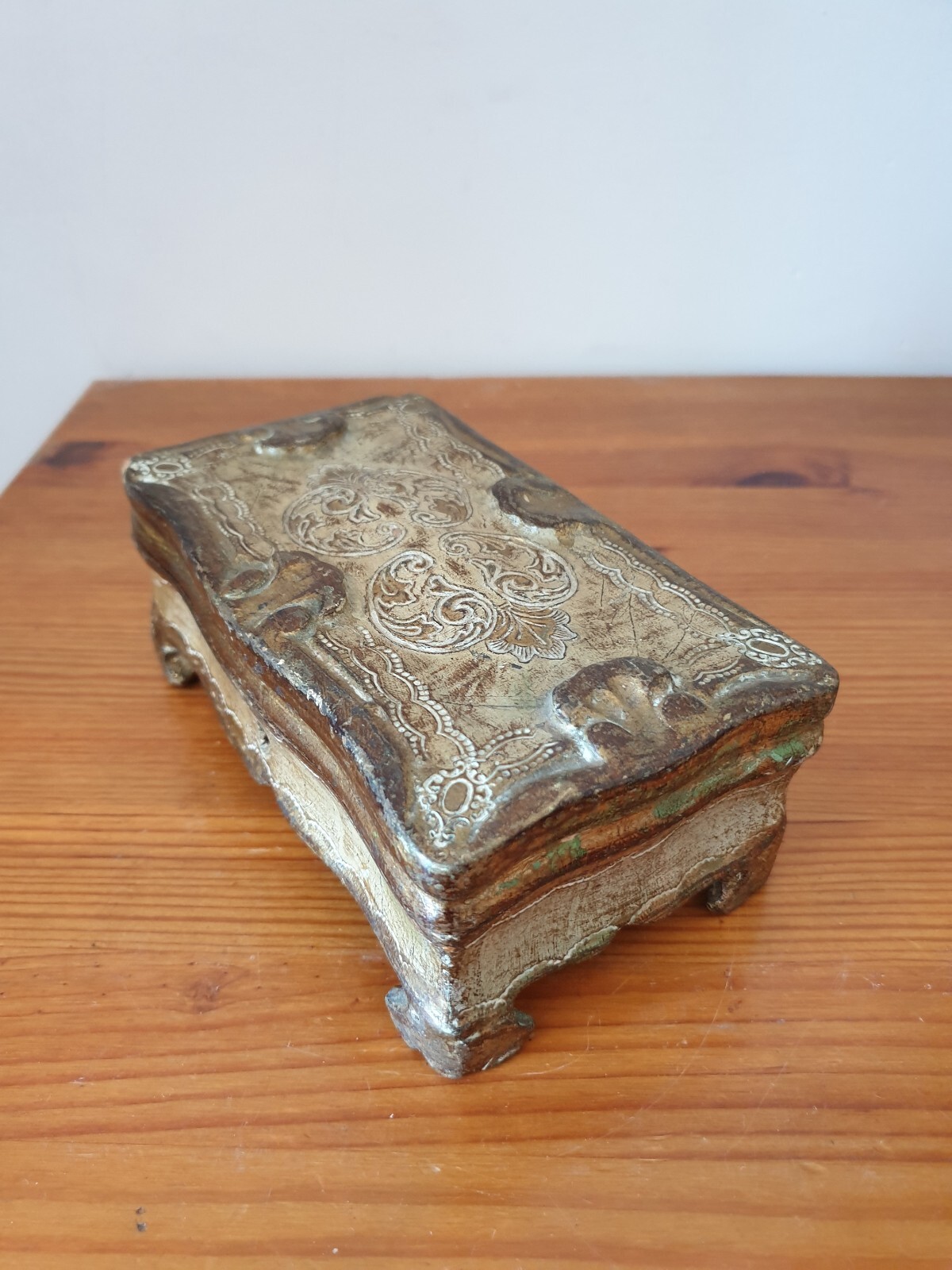 Magnifique boite à bijoux florentine ancienne en bois décorée à la main intérieur tissu 7x10x17 cm.