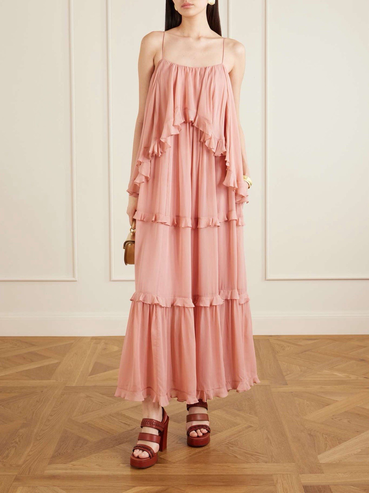ZIMMERMANN Robe Longue En Mousseline De Soie Rose À Volants Taille 1
