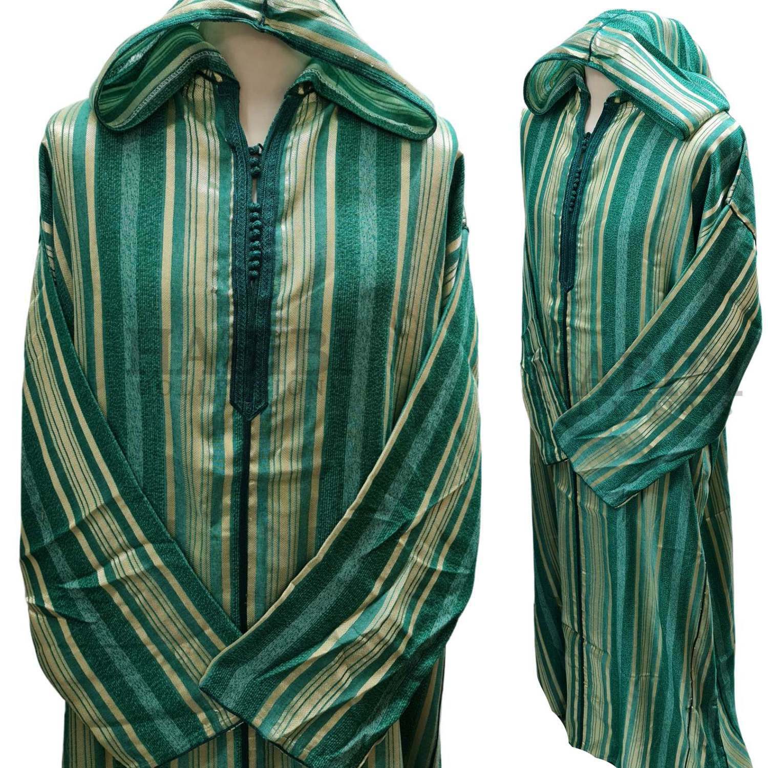 Coton Homme Marocain à Capuche Manches Longues Vert Or Rayé Thobe Juba