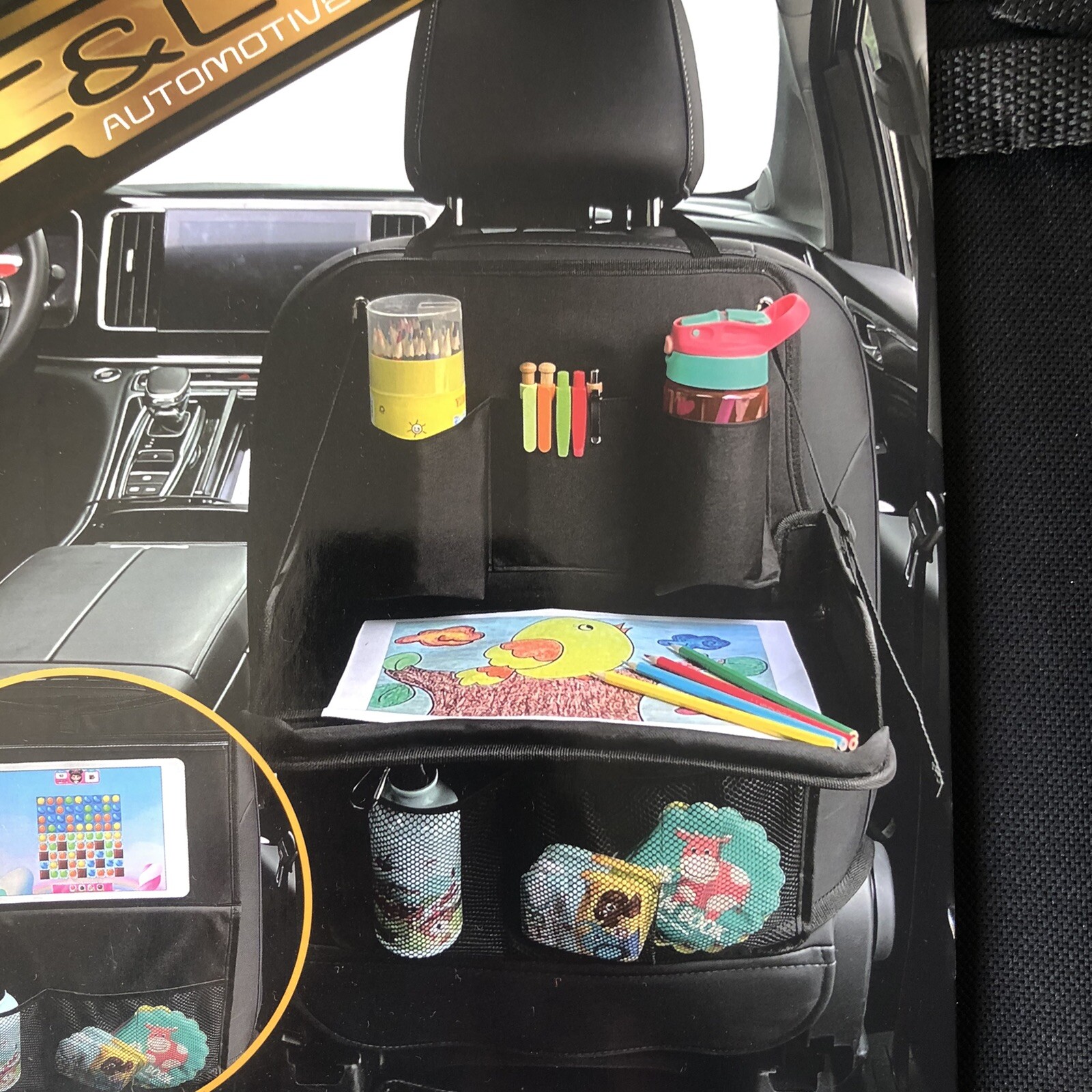 Organiseur pour siège arrière de voiture. - liens réglables pour un organiseur bien maintenu autour de l appuie tête. avec 1 tablette pour repas ou dessins. avec 1 pochette pour y insérer une tablette ipad (largeur de 36 cm).