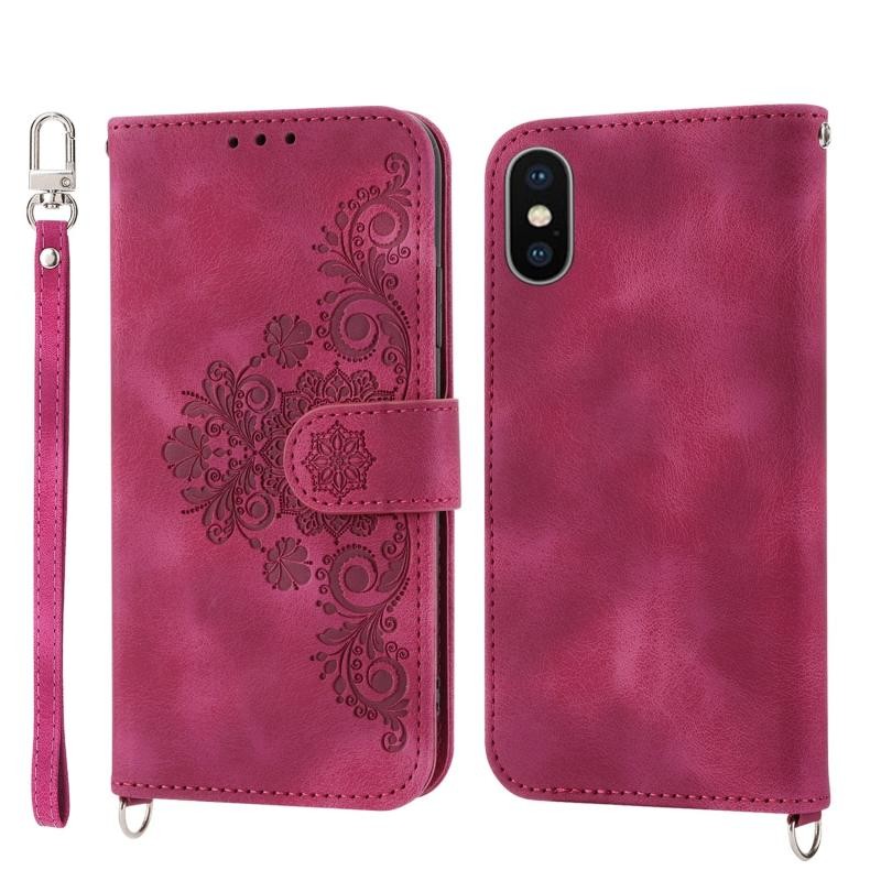 Étui portefeuille en cuir à fleurs en relief pour iPhone XS Max rouge vin