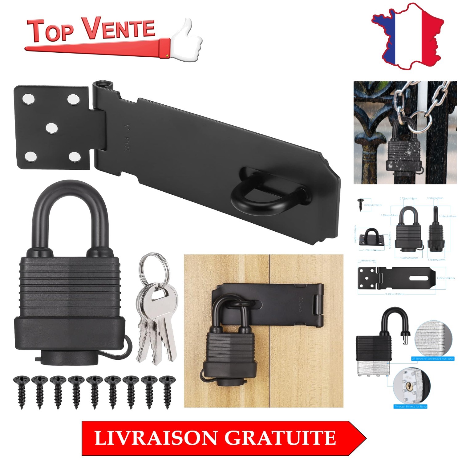 Serrure Polyvalente en Acier Inoxydable 3,5 cm. Cadenas de Sécurité Inclus. Comprend 1 hasp de verrou, 1 cadenas, 3 clés, et 7 vis pour l'installation. Avec sa facilité d'installation et sa flexibilité d'utilisation, cette serrure saura s'adapter à vos besoins variés, qu'il s'agisse de sécuriser votre garage, votre jardin ou vos portes intérieures.
