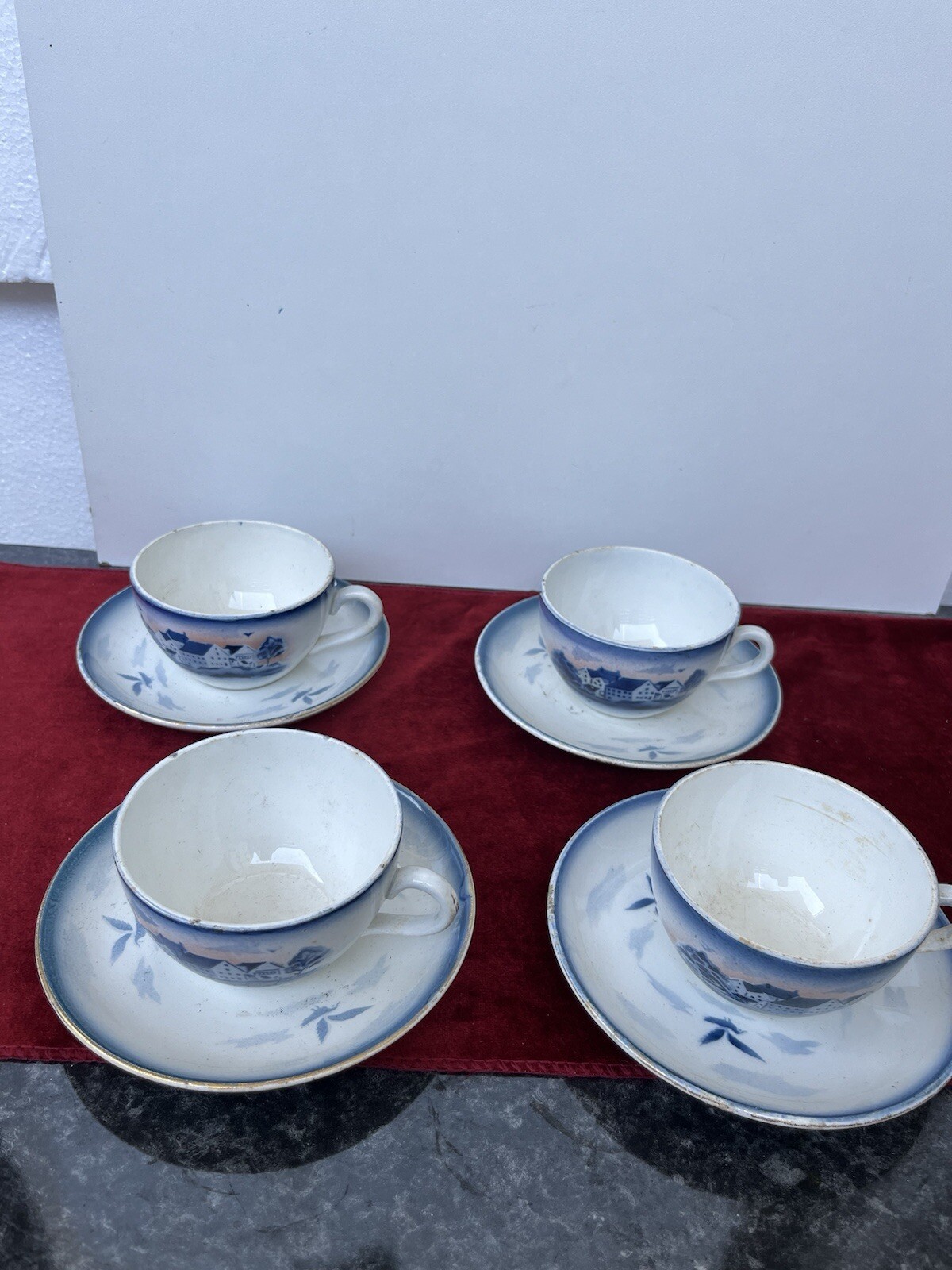 4 Tasses à café en faïence Sarreguemines Et Digoin. Il y a quelque tache et rayure pas d’éclat ni fissure Hauteur de la tasse : 5,5 cm. Diamètre : 9 cm Diamètre sous-tasse : 14 cm