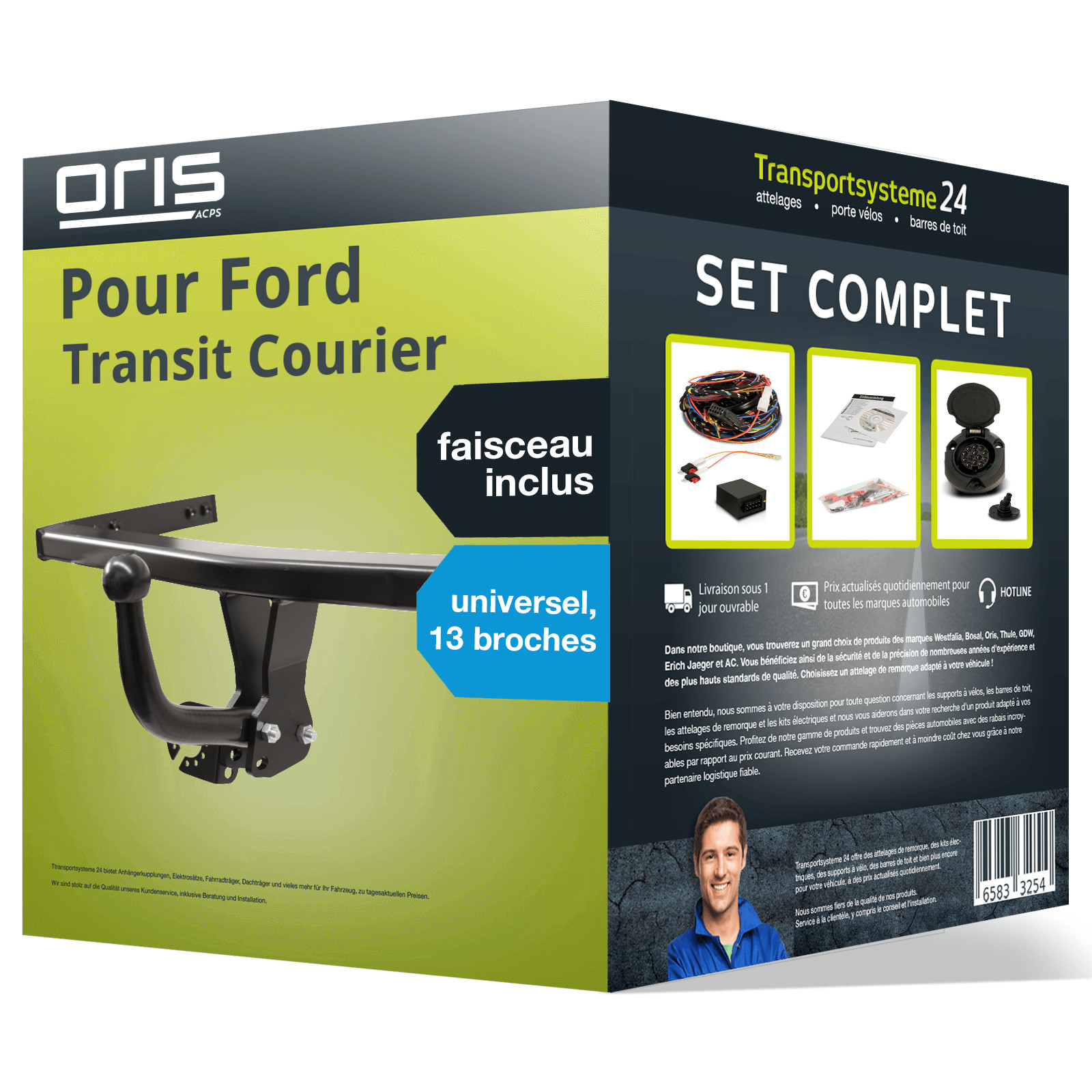 PACK COMPLET pour Ford Transit Courier 02.2014 - 12.2023, composé d'un attelage col de cygne Oris et d'un faisceau 13 broches universel TowTec. D’autres informations produit importantes consultables dans la notice de montage - veuillez cliquer sur le lien!.