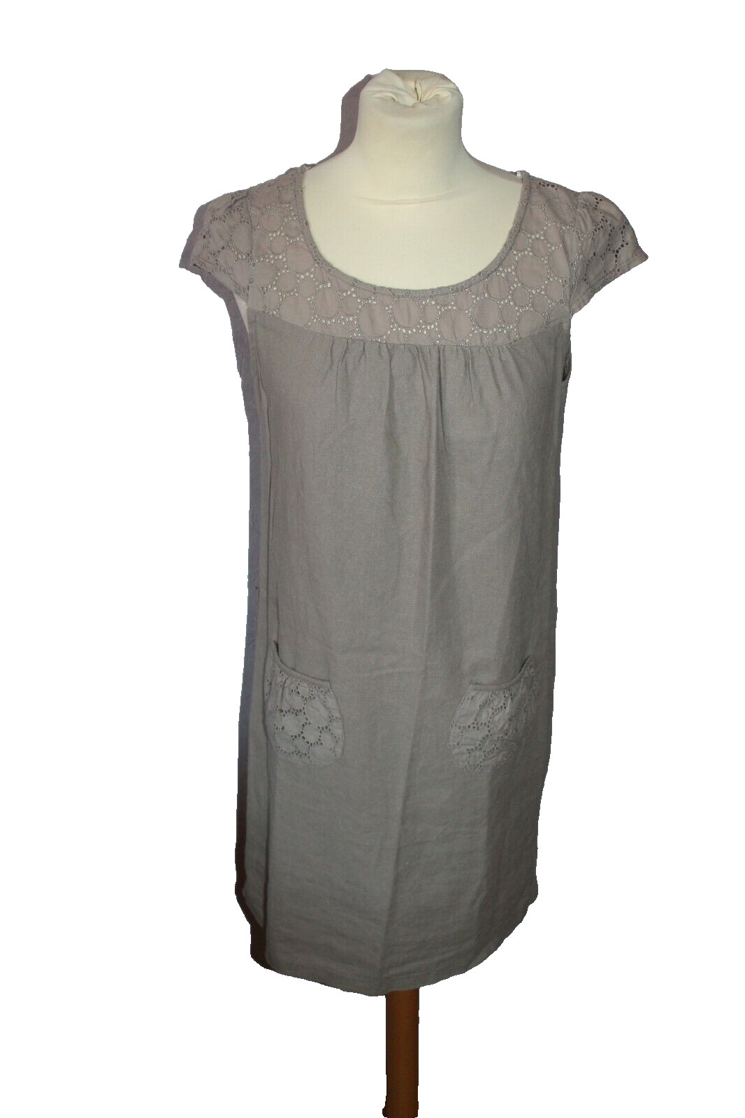 IN EXTENSO. COMPOSITION ROBE UNIE EN LIN (ETIQ COUPEE). TRES JOLIE ROBE SANS MANCHES AVEC BRODERIES. . LONGUEUR TOTALE 83 CMS. CARRURE 35 CMS.