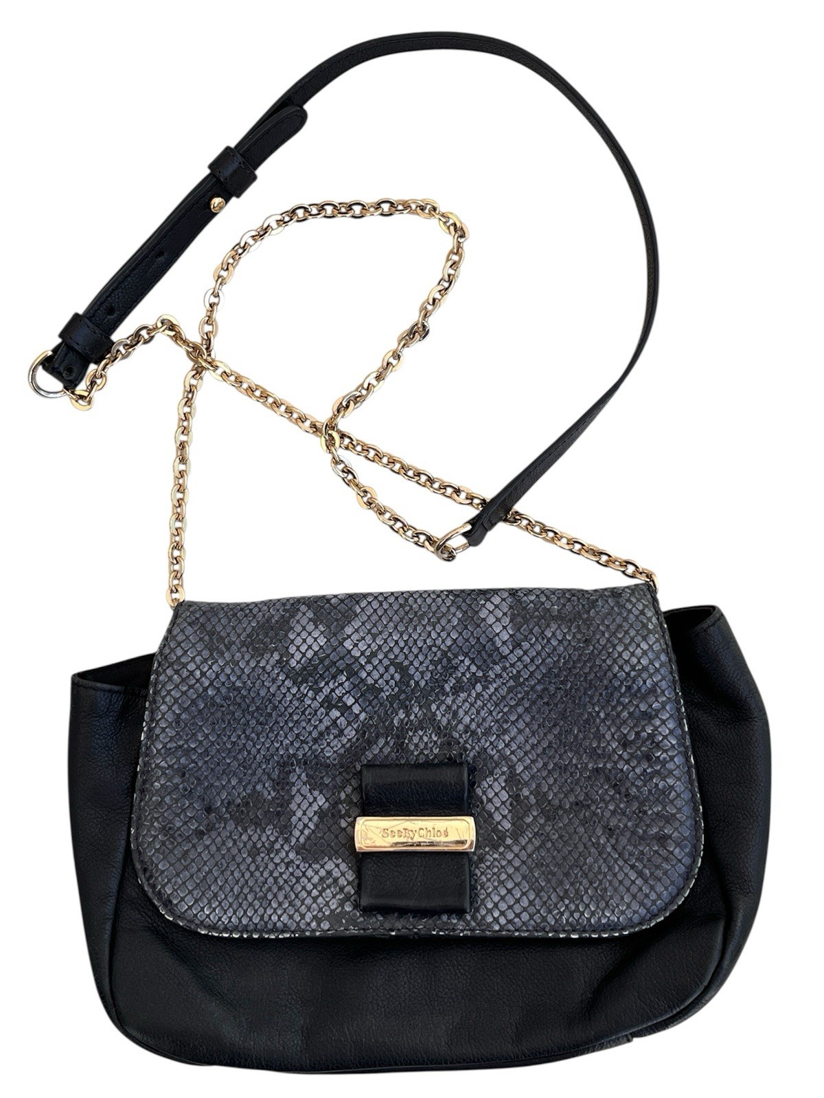 see by chloe Sac À Bandoulière Femme Cuir Souple Noir Motifs Effet Peau Serpent. État ::: bon état ( traces de griffure sur la quincaillerie avant ) Dimensions :::: largeur : 26 cm Hauteur : 14 cm Profondeur : 8 cm Hauteurs de lanière :: 57 cm Longueur de lanière :: 105 cm