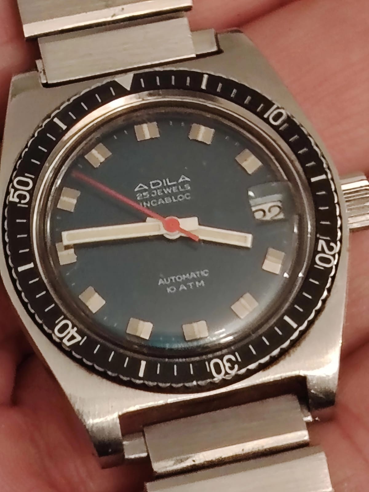 ÉCRIT A 12H ADILA 25 JEWELS INCABLOQUE AU DESSUS DE 18H AUTOMATIC 10 ATM ÉCRIT EN DESSOUS DE 18H T SWISS MADE T MAGNIFIQUE CADRAN. ÉTANCHE A 100M L'ÉTANCHÉITÉ NA PAS ETE TESTER DONC NAIS PAS GARENTIE.