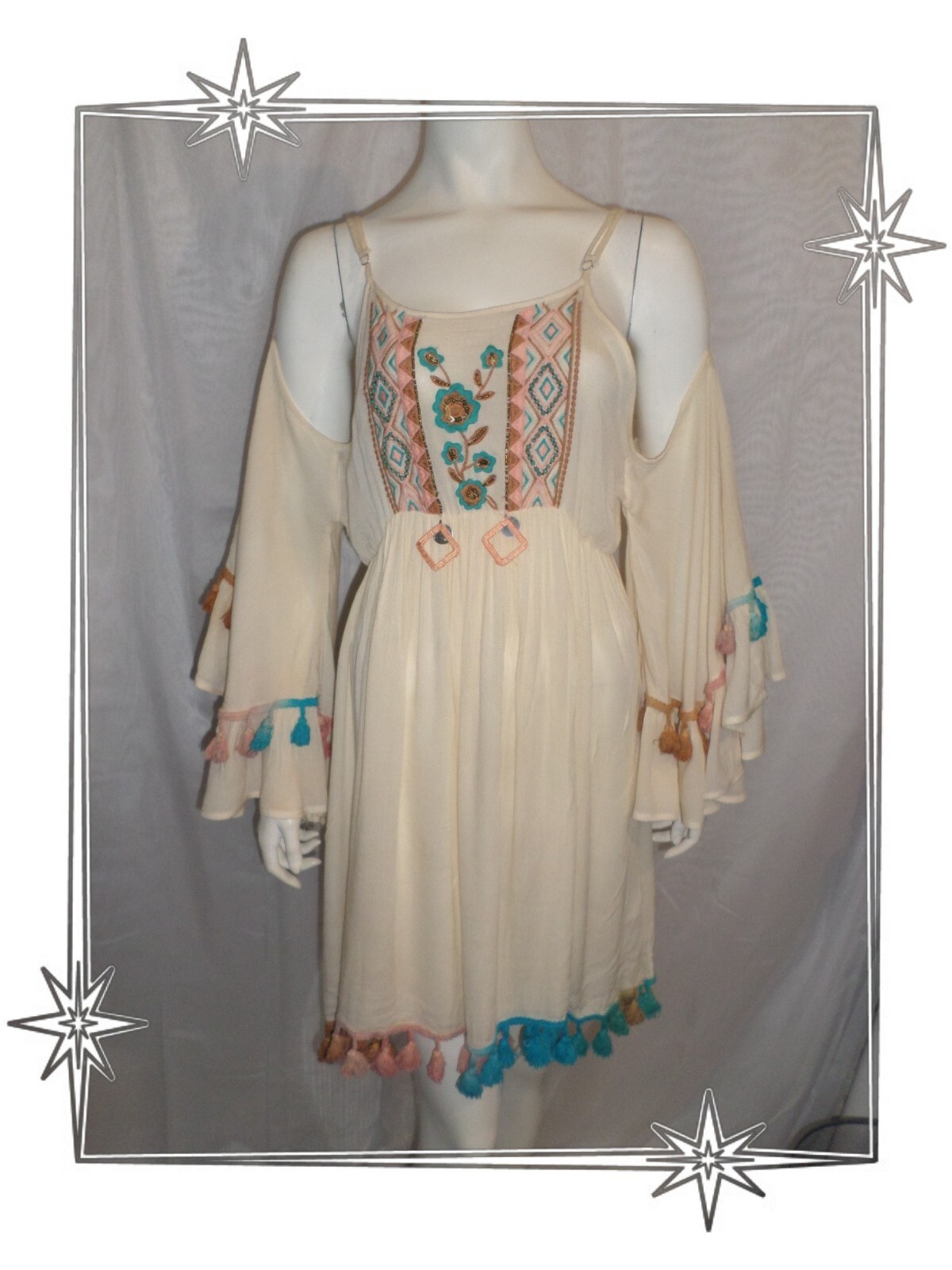 De couleur beige, saumon, vert, marron. Superbe Robe d'Eté. Bas de la robe évasée et galon avec pompons. Robe parfaite pour cet été à la plage, sorties. Taille S / M. Très beau motif brodé et paillettes sur le milieu devant.