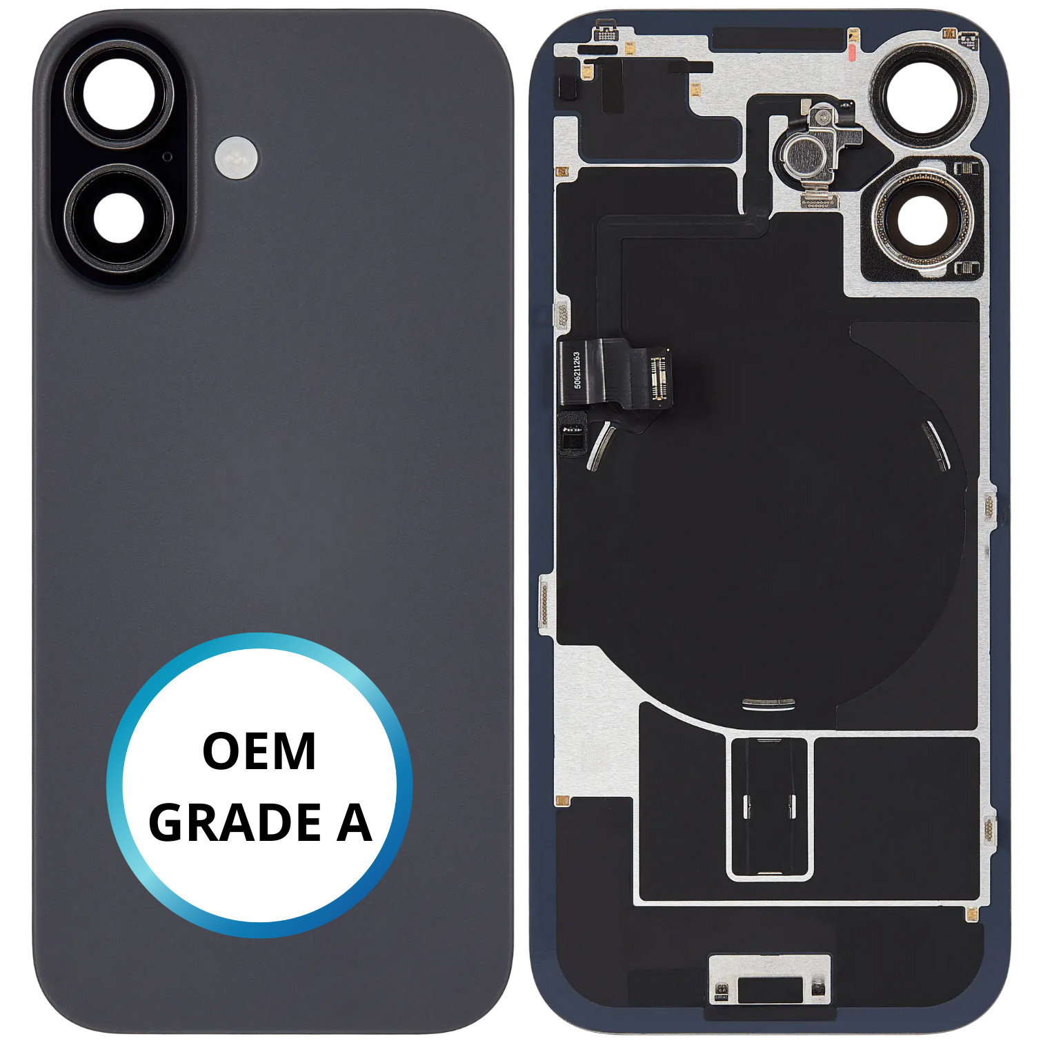 Vitre arrière - iPhone 17 OEM PULLED GRADE A. Nappe NFC + Flash. Plaque de fer intégrée.