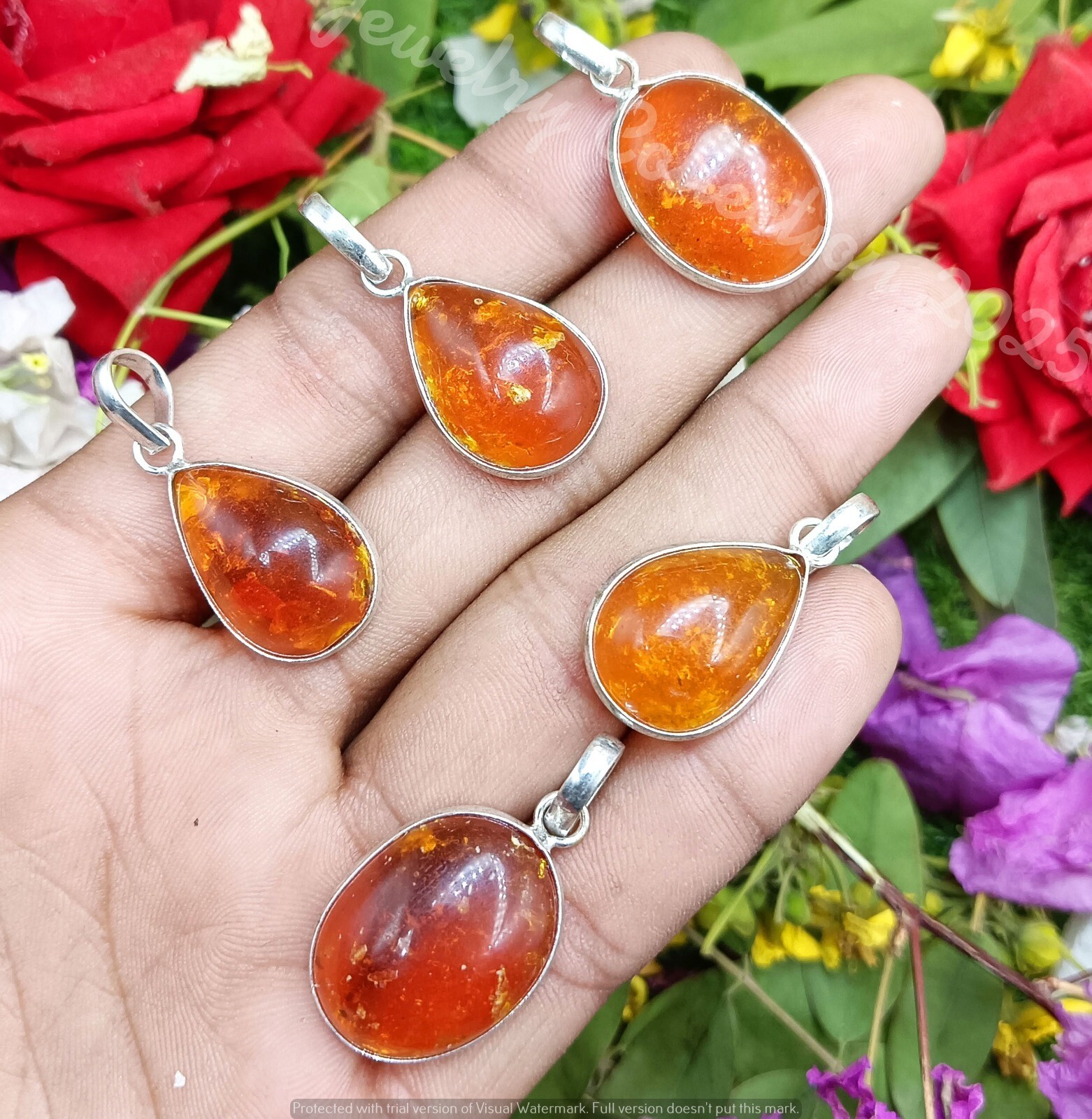 Pendentifs en pierres précieuses ambre de la Baltique - Lot de 5 pièces (plaqué argent 925). Design : Design élégant, élégant et intemporel avec d'authentiques pierres d'ambre de la Baltique. Color : tons dorés chauds avec des variations ambre naturel (peut inclure des nuances de miel, de cognac ou de jaune beurre).