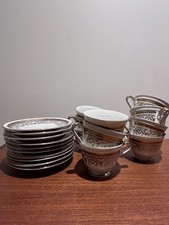 Service à thé de 12 piece avec ses tases, soucoupe et théière en porcelaine Le service à thé des décorations fleuris de couleur rose verte, dessus il y a aussi un oiseau de couleur bleu violet et vert, perché sur une branche avec des feuilles vertes et des bourgeons des papillons de couleur rose. Le bord supérieur de la tasse est doré