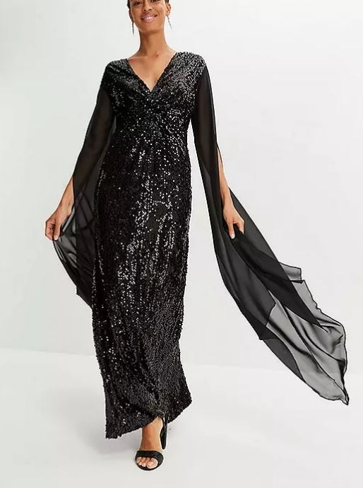 Robe longue de soirée à sequins scintillants avec d'énormes manches en mousseline. Lavable en machine Extérieur et doublure : 100 % polyester Manches : 100 % polyester Longueur régulière env. 146 cm Veuillez noter : les tailles européennes ont tendance à être plus petites que celles du Royaume-Uni. Nous vous suggérons de prendre une taille au-dessus pour un ajustement parfait !.