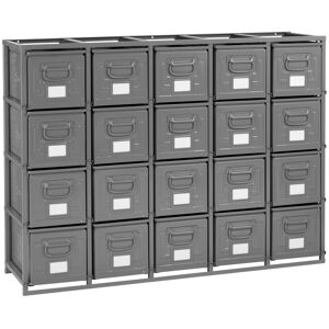 Rack de stockage avec caisses équipé avec : > Bâti métallique 20 postes. > 20 caisses métalliques finition vernie volume 40.5 litres > Dessus plan de travail. > Socle métallique Dimensions > Rack de rangement : L. 1765 x P. 460 x H.1300 mm. > Caisse métallique : L. 300 x P.450 x H.300 mm. > Poids total : 210 kg. Charge maxi : Maximum de 3 racks de stockage superposables&