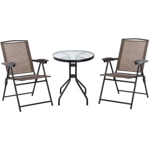 Description:Ce salon de jardin design 2 places composé d'une table carrrée pliable et de 2 chaises pliantes sera idéal pour aménager votre balcon, terrasse ou jardin. Mélant résine tressée et métal marron, cet ensemble de jardin apportera une touche d'élégance supplémentaire à votre extérieur.caractéristique:● Ensemble mobilier de jardin design composé d'une table carrée et de 2 chaises; ● Table pliable et chaises pliantes pour un usage pratique et un gain de place de rangement; ● Idéal pour une installation sur votre balcon, terrasse ou dans votre jardin; ● Subtile alliance des matériaux : métal et résine tressée imitation rotin pour plus d'élégance et ajouter une touche cosy à votre extérieur; ● Matériaux de qualité pour une meilleure résistance face aux aléas climatiques et un entretien facile; ● Aucun montage nécessaire : utilisation immédiate sans effort !Spécification:● Coloris : marron; ● Matériaux principaux : métal traité anticorrosion et résine tressée imitation rotin; ● Dimensions table : 60L x 60l x 72H cm; ● Dimensions chaises : 61L x 46l x 84H cm; ● Dimensions assise : 42L x 42l x 47H cm; ● Dimensions dossier : 46l x 17H cm; ● Dimensions table pliée : 94L x 61l x 13H cm; ● Dimensions chaise pliée : 99L x 46l x 15H cm; ● Charge max. table : 70 Kg; ● Charge max. chaise : 120 Kg; ● Réf. : 841-176contenu du colis: