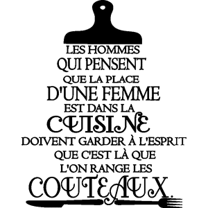 Des stickers muraux citations pour la déco ! Avec les stickers citation et ce Sticker Les hommes qui pensent que la place d'une femme est dans la cuisine, vous pourrez enfin décorer l'intérieur de votre cuisine à votre guise avec leur aide ! Où coller cet autocollant déco ? Ces stickers proverbes d