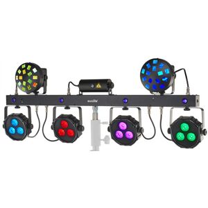 Eurolite LED KLS Laser Bar Pro FX-Set, Jeu de lumière compact, Barre DMX 4-en-1 avec laser, 2 effets Derby rotatifs à LEDs, 2 projecteurs à LEDs, 1 stoboscope à LEDs blanches et UV, 39 programmes intégres (avec les 4 unités d'effets) en mode automatique et musique, Contrôle à distance via pédalier sans fil et télécommande infrarouge, Laser de classe 2M, 2 diodes projetant des centaines de faisceaux rouges et verts, 2 effets Derby pour effets de boule à facettes équipés chacun de 6 LEDs (rouge, vert et bleu), 2 projecteurs à LEDs équipés chacun de 6 LEDs TCL (rouge, vert et bleu), Stroboscope équipé de 4 LEDs BCL (blanc et UV), Types de LEDs: Spot (2x): 6 x 6 Watt RGB avec angle de diffusion de 13°, Derby (2x): 6 x 2 Watt RGB, Stroboscope: 4 x 2 Watt blanc/UV avec angle de diffusion de 8°, Diodes laser: Rouge: 100 mW 650 nm, vert: 30 mW 532 nm, Modes de fonctionnement: DMX, automatique, maître/esclave, musique, Modes DMX: 3, 5, 10 ou 28 canaux, Entrée et sortie DMX sur XLR 3 broches, Alimentation: 100/240 V AC, 50/60 Hz, Consommation: 150 Watt, Entrée et sortie CEI, Dimensions: 1320 x 145 x 320 mm, Poids: 7,3 kg, Livré pré-assemblé dans une housse de transport, Livré *sans* pied (35 mm)