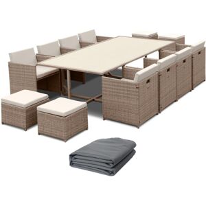 Pour un rangement optimal, les poufs s’imbriquent dans les fauteuils qui se rangent eux-mêmes sous la table.Pas besoin de ranger l’ensemble au fond du garage, son look en forme de cube ravira vos amis, et ne fera pas "tâche" dans votre jardin ou sur votre terrasse.La totalité de la structure métallique est en acier galvanisé, recouvert d'une couche de peinture thermolaquée. Ce traitement vous offre une plus grande protection contre l'oxydation de l'acier.Les dossiers et accoudoirs ont une largeur de 3cm afin de garantir une assise et un confort maximal. Une poignée derrière chaque dossier vous permettra de retirer et ranger les fauteuils plus facilement.Les coussins (6cm), en polyester, sont résistants à l'eau et déhoussables à l'aide d'une fermeture éclair. De plus, ils sont tous munis d'un passepoil !La table est livrée avec un plateau en verre trempé noir (5x plus résistant que le verre traditionnel) de 5mm d’épaisseur.Dimensions :1x Table : 222x110x73cm6x Fauteuil : 52,5x53x67,5cm / 6,8kg4x Pouf : 42,5x42x5x34cm / 2,85kgHauteur d’assise : 48,5cmHauteur des accoudoirs : 67,5cmEpaisseur de la vitre : 5mmEpaisseur des coussins : 5,5cmDensité des coussins : 16kg/m3Poids maximum d’assise : 110kgHousse de protection : Matière : Polyester, revêtement polyamideDensité : 180g/m², 300x300DRésistante aux UV, Résistante à l'eau / déperlanteSystème d'attache : cordon de serrage4 aérationsDimensions : 230x112x70cm