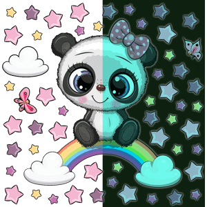 Des stickers phosphorescent pour votre déco ! Avec les stickers muraux phosphorescents et ce Stickers phosphorescents panda fille sur arc-en-ciel, vous pourrez enfin décorer l'intérieur de votre chambre à votre guise ! Ce sticker phosphorescent doit être exposé à la lumière pendant 1h pour pouvoir