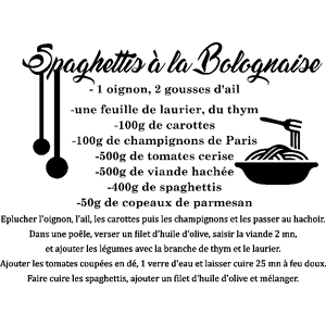 Des stickers cuisine pour votre déco ! Avec ce stickers pour la cuisine représentant un Sticker citation recette Spaghettis à la bolognaise vous pourrez décorer votre intérieur de manière originale et facile! Vous allez pouvoir donner une nouvelle vie à cette pièce si fréquemment utilisée ! Où coll