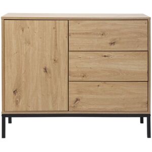 Caractéristiques produit: Découvrez notre commode 1 porte 3 tiroirs, très pratique pour ranger vos affaires dans un meuble compact et design. Idéal comme petit meuble de rangement type buffet dans une pièce de vie ou comme commode dans une chambre. Matière principale : panneaux de particules certifiés FSC, issus de forêts gérés durablementPiétement en métal noir.Entièrement recouvert d'un papier décor chêne. Ouverture des tiroirs par simple pression grâce à l'assistance mécanique du système sans poignée push/pull. Dimensions produit: Longueur 90 cm x Largeur 40 cm x Hauteur 80 cm - Poids net : 31.1 kg. Dimensions colis: Colis n°1 : Longueur 100 cm x Largeur 49.5 cm x Hauteur 11 cm. Poids : 21.5 kgColis n°2 : Longueur 70 cm x Largeur 58 cm x Hauteur 10 cm. Poids : 12.3 kgPoids brut : 33.8 kg.
