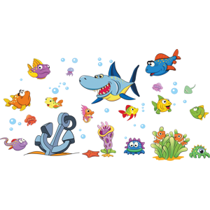 Des stickers animaux pour votre déco ! Avec les stickers muraux animaux multicolore et ce Stickers animaux poissons marins et requin, vous vous approprierez enfin votre intérieur ! Dimensions des stickers animaux : Ce sticker déco chambre enfant se compose de : 1 sticker requin, 1 sticker ancre, 1