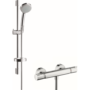 Combinaison de douche hansgrohe Croma 100, chromé , EcoSmart/Ecostat, 27032000, DN 15, composée de : Croma 100 Vario EcoSmart / Unica'C set barre de douche 0,65 m (# 27776000), thermostat de douche Ecostat Comfort apparent DN 15 (# 131160000), inclus Disque de nivellement pour carrelage (# 97450000)