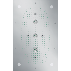 hansgrohe Raindance Douche de tête Rainmaker Numéro d'article : 28418000 DN15 avec éclairage Douche de tête dans un design rectangulaire pour une installation au plafond avec éclairage 4 lampes halogènes basse tension à réflecteur de 20 watts avec bloc d'alimentation 80 VA La douche de tête doit être commandée via 3 Verbraucher Commande via le commutateur à quatre voies Quattro ou iControl mobile (électronique) recommandée Paramètres de faisceau : Rain AIR - fonction centrale de douche de tête Rain AIR XXL - pluie douce sur toute la surface Whirl AIR - 3 jets de massage rotatifs et 3 combinaisons mixtes tous les jets avec technologie AIR à compléter par : Corps de base pour Rainmaker rectangulaire #28414180 iBox Universel #01800180 (non inclus) recommandé avec le thermostat HighFlow #15715000