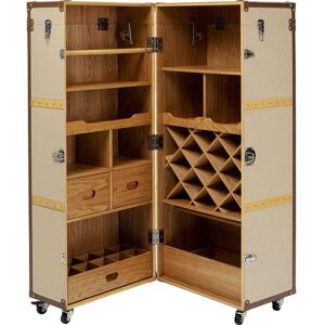 Cette malle qui contient un bar est une vraie pièce d'exception. Différents compartiments et porte-bouteilles ainsi qu'un plateau amovible se trouvent à l'intérieur pour des apéros réussis. Son revêtement en simili tressé beige est facile d'entretien. Livré monté avec les roulettes à fixer.
