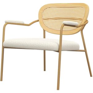 Avec son look délicieusement rétro, le fauteuil BALI mêle inspirations scandinaves et lignes vintage. Un mix réussi de matières avec sa structure en métal décor chêne, son assise rembourrée revêtue d'un tissu bouclé Ecru et son dossier galbé en bois massif et rotin naturel.