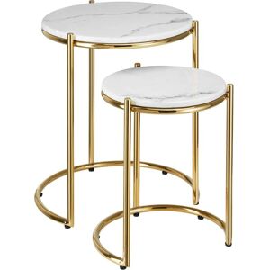 Meubles élégantsLa table d'appoint Elsa de tectake en ensemble pratique de 2 pièces associe un design exclusif à une grande fonctionnalité et valorise votre maison avec style. Une grande et une plus petite surface de table offrent suffisamment de place pour la décoration, les boissons ou vos en-cas préférés.Une combinaison parfaiteL'association de marbre élégant et d'acier confère à la table basse non seulement un aspect luxueux, mais garantit également une stabilité et une capacité de charge de premier ordre. Les pieds en plastique réglables en hauteur et antidérapants assurent en outre une stabilité absolue sur tout type de sol. Particulièrement pratique : la plus petite table d'appoint peut être glissée sous la plus grande pour gagner de la place – idéal pour des concepts d'habitation flexibles avec peu d'espace.Un véritable incontournableUn autre point fort est que les deux meubles sont livrés déjà montés et sont donc prêts à l'emploi en un rien de temps. De plus, les tables brillent par leurs surfaces particulièrement faciles d’entretien, un chiffon humide suffit et les plateaux en pierre semblent neufs !Que ce soit dans le salon, la chambre ou le bureau – les deux tables d'appoint modernes Elsa de tectake s'intègrent parfaitement dans tout intérieur. Caractéristiques Techniques: Grande tableDimensions totales (⌀ x H): env. 43 x 50,5 cmPlateau de table (⌀ x H): env. 40 x 1,8 cmCapacité de charge: 12 kgPoids du plateau en marbre: env. 5,7 kgPoids total: env. 7,1 kgMatériaux: marbre, acier galvanisé, polypropylène Petite tableDimensions totales (⌀ x H): env. 33 x 40,5 cmPlateau de table (⌀ x H): env. 30 x 1,8 cmCapacité de charge: 8 kgPoids du plateau en marbre: env. 2,6 kgPoids total: env. 4,9 kgMatériaux: marbre, acier galvanisé, polypropylène
